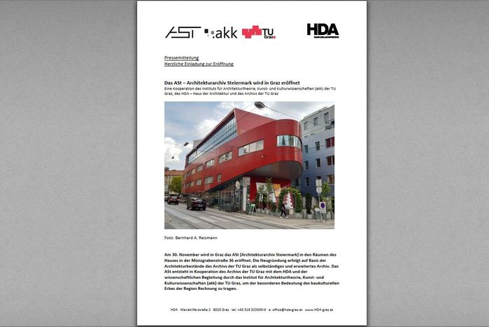 Die Neugründung des ASt (Architekturarchiv Steiermark) im November 2022 erfolgt auf Basis der Architekturbestände des Archivs der TU Graz als selbständiges und erweitertes Archiv. Das ASt ist eine Kooperation des Archivs der TU Graz mit dem HDA und der wissenschaftlichen Begleitung durch das Institut für Architekturtheorie, Kunst- und Kulturwissenschaften (akk) der TU Graz, um der besonderen Bedeutung des baukulturellen Erbes der Region Rechnung zu tragen.