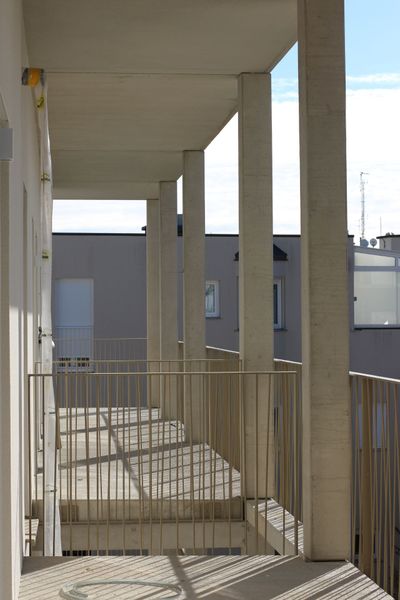 Die Wohnbebauung, eine Gruppierung von fünf Punkthäusern mit verschiedenen Höhen, reagiert städtebaulich auf die umgebende Bebauungsstruktur, die vorwiegend aus Einzelobjekten unterschiedlicher Größen und Höhen besteht. Es entsteht ein vielschichtiges Außenraumangebot mit differenzierten Übergängen von öffentlichen zu halböffentlichen und privaten Freibereichen.