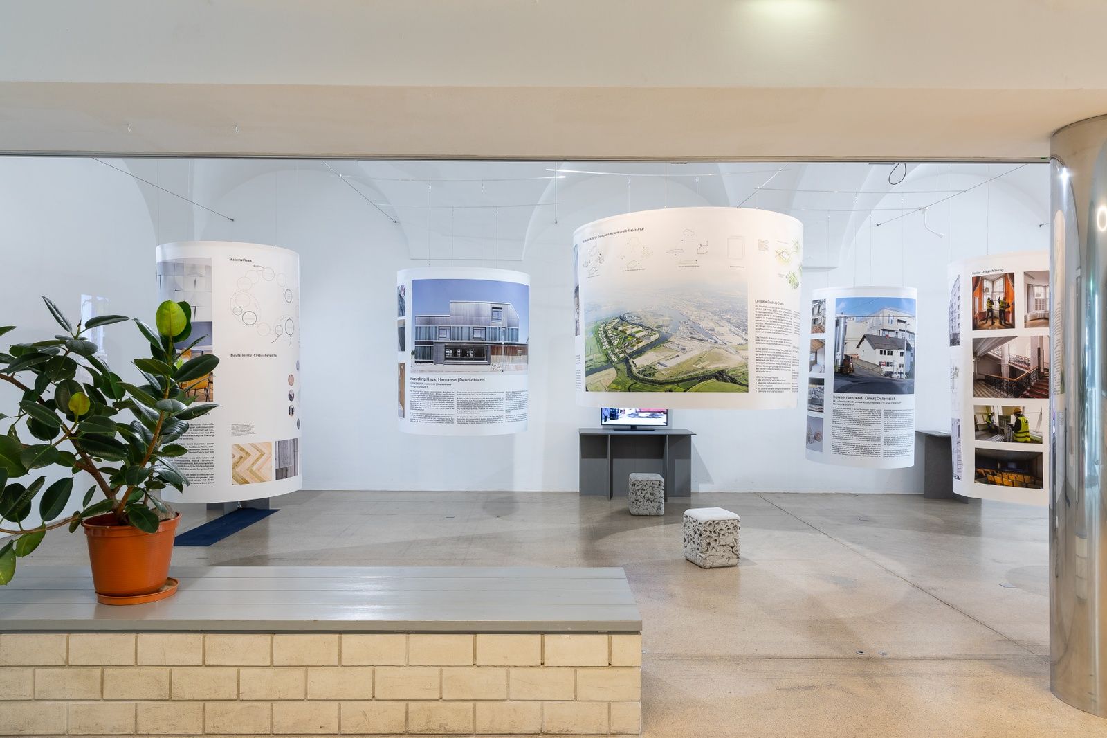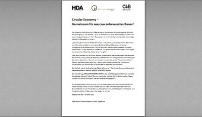 Die Endlichkeit von Material- und Energieressourcen stellt das Bauwesen vor neue Fragestellungen und Aufgaben im Kontext der Herausforderungen des Klimawandels. Die Ausstellung im HDA widmet sich dem Thema "Materialkreislauf". Sie stellt Studien und praktische Beispiele von Architekturen, Umnutzungen und Systemkreisläufen vor, die durch ihre hohe gestalterische Qualität sowie durch ihre beeindruckende Genese aus wiederverwendeten Materialressourcen überzeugen.