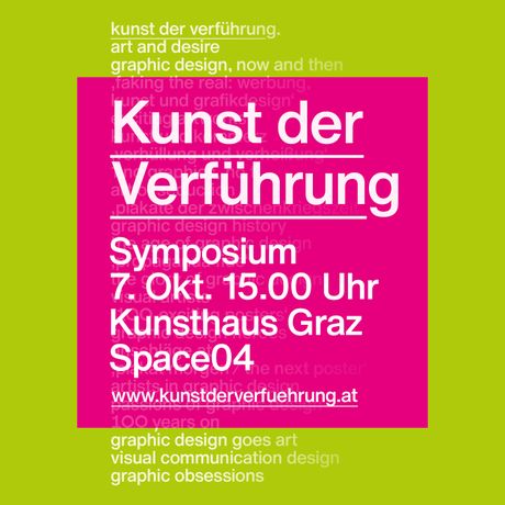 Im Rahmen des Kooperationsprojekts "Kunst der Verführung", an dem acht Institutionen aus Kunst, Wissenschaft und Wirtschaft beteiligt sind, findet ein gemeinsames Symposium zum Thema statt. In zwei Panels sprechen ExpertInnen aus Kunst, Werbung, Architektur und Design über die Kommunikation im öffentlichen Raum sowie die Zukunft der Kommunikation in Hinblick auf technologische Entwicklungen. Das Symposium ist zeitgleich auch der Kick-Off zur Creative Night Graz.