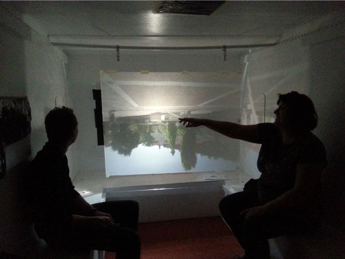 Von außen macht das fahrbare Wohnmobil vor allem mit seinem schwarz-gelb gestreiften Design auf sich aufmerksam. Begibt man sich ins Innere, wartet ein neues Bild der Außenwelt auf die BesucherInnen. „Mit dem physikalischen Wirkungsprinzip einer Camera Obscura können versteckte Potenziale von Orten aufgespürt und sichtbar gemacht werden“, sagt das ArchitektInnen-Team von balloon_Rampula/Gratl/Wohofsky. Mehrere eingebaute Linsen in den Wänden sowie in der Decke des Anhängers können unabhängig voneinander geöffnet oder geschlossen werden. Die Camera Obscura wird so zum technischen Nachbau des menschlichen Sehapparats. Bilder der Außenwelt werden in das Innere des Wohnwagens projiziert, wo das sehende Subjekt und das betrachtete Objektiv aufeinandertreffen. Die mobile Camera Obscura ist ein künstlerisches Analyseinstrumentarium eines Ortes, dessen Begrenzungen innen – außen, oben – unten, Subjekt – Objekt in Frage gestellt werden. Die Camera Obscura ermöglicht so bekannte Orte neu zu sehen und zu erleben.