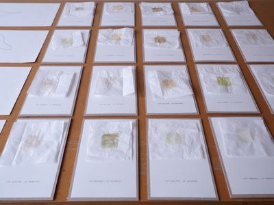 Maria Lamott, eine in der Schweiz lebende Architektin, war im Dezember 2021 als Artist in Residence in Krems. Während dem plötzlich verhängten Lockdown unternahm sie in der klirrenden Kälte vier ausschweifende, tagesfüllende Spaziergänge in den Westen, Osten, Süden und Norden von Krems. Sie sammelte Blätter, Blumen, Erde oder Steine deren Farben ihr für die Landschaft und die gebaute Umwelt der Region charakteristisch erschienen. Die gefundenen Materialien zerrieb sie vor Ort zu Pigmenten, die sie auf Papier übertrug. So entstand eine farbliche Palette der Landschaft.