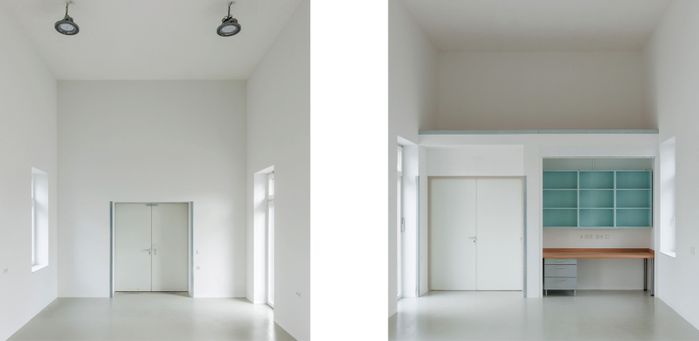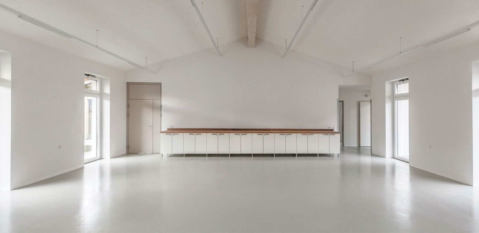 Besonderes Augenmerk wurde gelegt auf die Qualität der Belichtung und Beschattung der Räume; weit auskragende Dachüberstände beschatten die großzügig dimensionierten Fenstertüren, die von Nord und Süd Licht in die bis unters Dach offenen Gruppenräume lassen. Die Räumlichkeiten der Einrichtung sind so konzipiert, dass Menschen mit erhöhtem Unterstützungsbedarf die Möglichkeit haben überall zu arbeiten. [Quelle: www.noe.lebenshilfe.at]