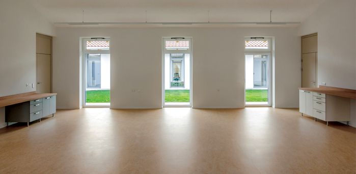 Häuser und Innenhöfe bieten eine Abfolge von öffentlichen und privaten Funktionen, von laut zu leise an. Einladend und für alle offen das erste Haus, hier findet Begegnung stattf; Begegnung der KlientInnen beim gemeinsamen Mittagessen, aber auch Begegnung mit Gästen und KundInnen, sei es beim Verkauf der eigenen Produkte, bei Veranstaltungen oder Festen. Der erste Hof hat die Funktion eines Gastgartens. Haus zwei und drei bieten den Werkgruppen der Industrie und Tischlergruppe Platz, der zwischengelagerte Innenhof kann für Pausen aber auch zum Arbeiten genutzt werden.