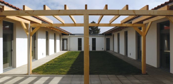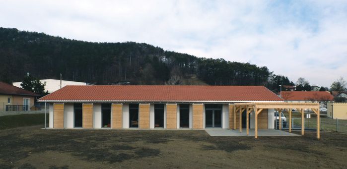 Entstanden ist ein ebenerdiger Bau mit ca. 1000 m² Nettofläche in einer Abfolge von 4 Häusern und Innenhöfen. Um innerhalb einer so großen Anlage Wohnlichkeit zu gewährleisten und den einzelnen Arbeitsgruppen individuellen Raum zu geben, war es dem Atelier Hochstraße wichtig, das Raumprogramm in funktionale Einheiten zu gliedern. Dies wird durch einzelne Baukörper in angemessener Dimensionierung, die dem Maßstab ländlicher Bebauungsstrukturen entsprechen, erreicht. Das Projekt wurde für den Landespreis für vorbildliche Bauten in Niederösterreich eingereicht.