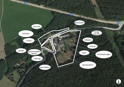Der Hof hat das ungefähre Ausmaß von 27 mal 27 Metern. Es ist quasi ein doppelter Streckhof mit zwei L-förmigen Trakten, der Einfahrt in der Mitte und einem Hof mit ca. 300 m² dazwischen. - Er steht mit dem Rücken zum 1-Geschoss hohen Hang, mit Kellern darunter.