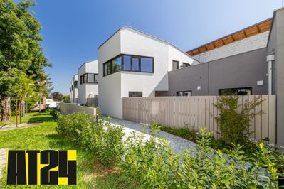 Die Häuser liegen im Zentrum von Guntramsdorf. In einem städtebaulich heterogenen Umfeld verbinden sie bestehende mit neuer Architektur. X42 Architektur hat die Wohntypologie „Reihenhaus“ für diesen speziellen Ort neu interpretiert: Der bestehende Gebäudeteil der ehemaligen Schuhleistenfabrik an der Hauptstraße wurde umgebaut und erweitert. Im hinteren Teil des Nord-Süd gestreckten Grundstücks haben die PlanerInnen sieben Stadthäuser mit jeweils einem eigenen, vorgelagerten Garten auf einem offenen Garagendeck in einer Zeilenstruktur angeordnet. Die Aufenthaltsräume im Erdgeschoss orientieren sich zu diesen introvertierten Gärten hin.