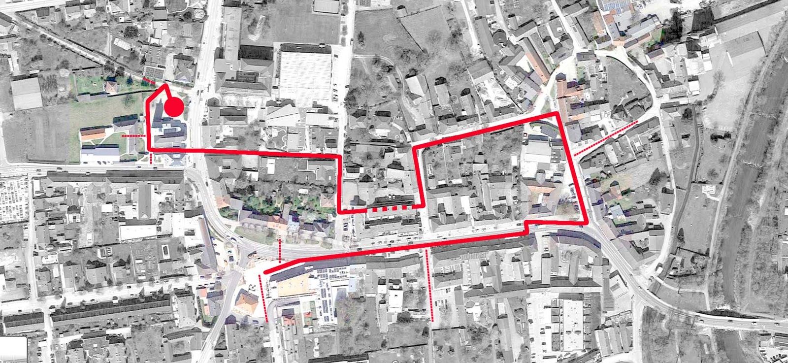 Das Leuchtturmprojekt der Gemeinde stellt der neue Hauptplatz dar (Planung: schumacher.schindl.freiß), bei dessen Errichtung 2021 nicht nur eine dem Ortsmaßstab angepasste Neubebauung errichtet, sondern auch der gesamte öffentliche Raum klimagerecht umstrukturiert wurde. Über einer Tiefgarage entstand ein neues Ortszentrum mit geschäftlich genutzter Erdgeschoßzone und mit darüberliegenden Wohnungen und einem von der Bevölkerung gewünschten Ärztezentrum. Alle Dächer sollten begrünt ausgebildet werden. Um unterschiedliche Funktionen unterzubringen (Bauernmarkt, Treffpunkt, Aufenthalt, Schanigarten u.v.m.), wurde die Hauptstraße verlegt und der Platz vergrößert. Die gepflasterten Platzoberflächen wurden versickerungsfähig und rund um das renovierte gründerzeitliche „Rothaus“, dessen künftige Nutzung noch offen ist, unversiegelt ausgeführt. Das Platzmobiliar umfasst Trinkbrunnen, Pergola, Schattenspender und Sitzbänke. Die Bepflanzung wird von Sträuchern und Beeten gebildet und ergänzt den weitgehend erhaltenen historischen Baumbestand. Auch die Plätze rund um die Kirche und das Gemeindeamt wurden im Zuge der Zentrumsentwicklung erneuert und barrierefrei gestaltet. Die gelungene neue Platzfolge erzeugt eine angenehm ruhige und zurückhaltende Stimmung.