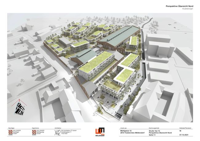 Das Umnutzungskonzept „WERK MÖLLERSDORF“ strebt einen attraktiven Stadtteil mit gemischt genutzten Flächen an, der durch gezielte städtebauliche Eingriffe das nahegelegene lokale Ortszentrum beleben und aufwerten soll. Zwei gestalterisch anspruchsvolle Hallen bleiben erhalten. Die übrige Bebauung wird durch teils aufgestockte, teils neu errichtete Gebäude ersetzt bzw. ergänzt. Die Neustrukturierung schreibt das lineare Grundmuster der Bestandsbebauung durch in der Höhe moderat gestaffelte und mit rundumlaufenden Freiräumen ausgestattete Wohnzeilen fort. Mit Hilfe von differenzierten Grundrissen und Größen strebt das Wohnungsangebot eine durchmischte Bewohner:innenschaft an. Fassadenberankungen, Dachbegrünungen und Photovoltaikanlagen auf den Bestandshallen sowie Erdwärmenutzung gewährleisten ein klimagerechtes und ökologisch verträgliches Projekt mit einer neutralen CO2-Gesamtbilanz. Die Freiräume sollen weitgehend entsiegelt werden. Neue Wege und Brücken über den Mühlbach - auch für Radfahrer:innen - und die Vergrößerung der bestehenden Freiflächen sollen das Areal künftig zu den Nachbarschaften in alle Richtungen öffnen. Gemischtgenutzte Gebäude sollen ein lebendiges Milieu generieren, das als Ergänzung zu den bestehenden Angeboten der Umgebung (Fleischer, Bäcker, Gastwirt) den Ortskern sozioökonomisch aufwertet und neue Arbeitsplätze schafft: Geschäfte, Museum und Depot sowie, zum Teil auch in den Obergeschoßen, Raumangebote für Dienstleistungen. Durch den Erhalt der historischen Giebelwände und die Rückstaffelung der Kubaturen an der Mühlgasse respektiert das Projekt den Maßstab der Umgebung. Die für den Stadtteil wohl attraktivste Maßnahme stellt die Öffnung des Mühlbaches an der Mühlgasse dar, der an dieser Stelle eine neue Brücke erhält und gemeinsam mit einem neuen Vorplatz künftig zum Treffpunkt, Aufenthalts- und Identifikationsort werden kann.